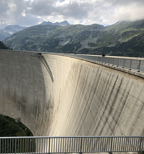 The Kölnbrein dam: 200 m high, 626 m long with the "airwalk" platform hanging high and transparent over the lake