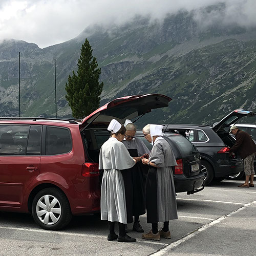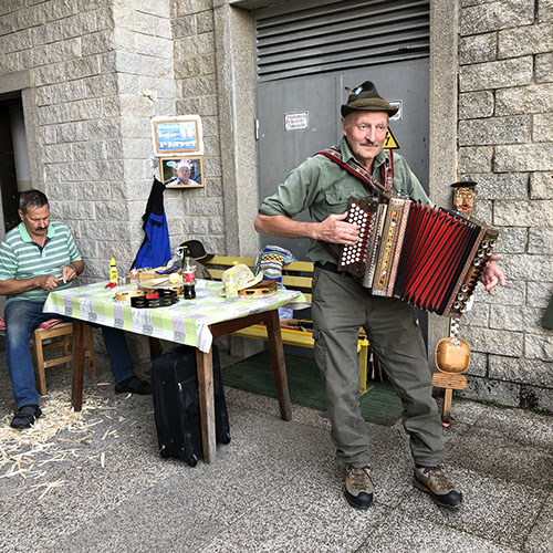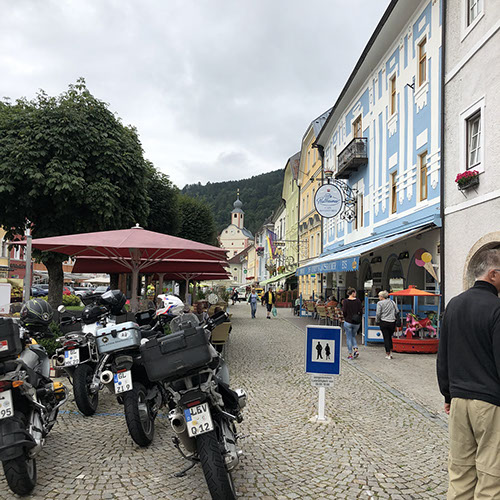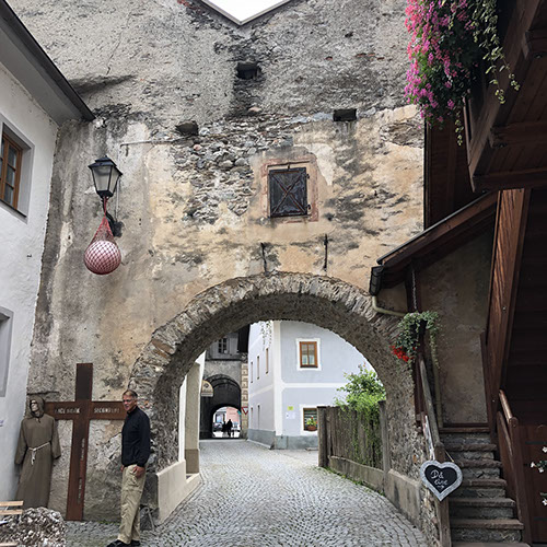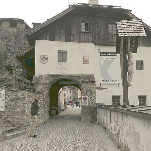 Drive to Gmünd, a charming little town where Volker bought me nice ear rings from a jewellery that was closing down definitely. After buying the Kärnten Card for 2 weeks (59€) including many attractions, cable cars etc. we visited the Wiliam Turner exhibition in the main tower in Gmünd in Kärnten (it would have cost 9 €/pax! but is included in our card) We had lunch at the Gasthof Kohlmayr (very good 30€). Coffee at Café Piccolo (6,90€) and drive to the Kreuzeck Panoramic cable car in Tratten/Kolbnitz (would have cost 11€ return). We took one at 15:30 and spent almost all our time in the café at the top because there was animation with accordion music. A short walk to the reservoir and back with the last train down at 17:00. We stayed here overnight but did a short walk through the village before finishing our day. N46º52'15" E13º18'34"