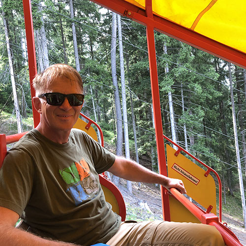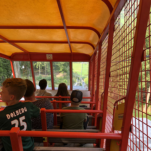 Sitting in the Kreuzeck Panoramic cable car that goes steep up (78ºC slope!)