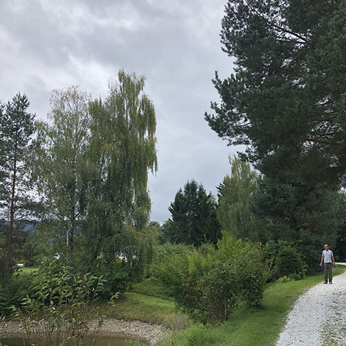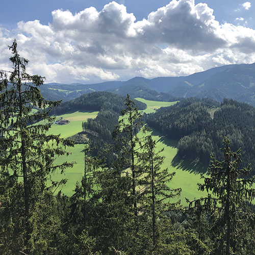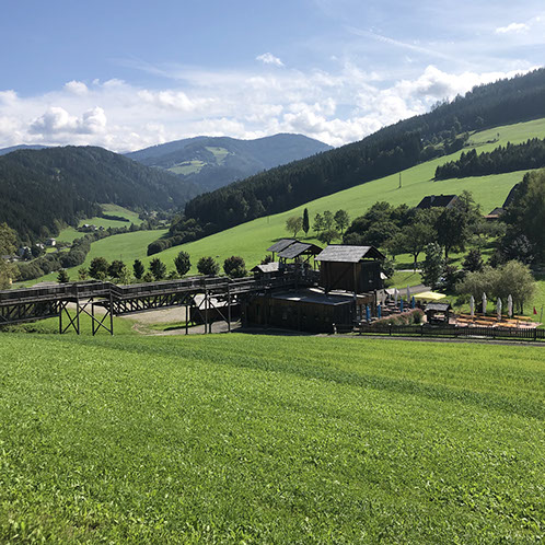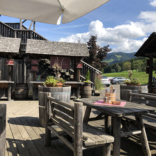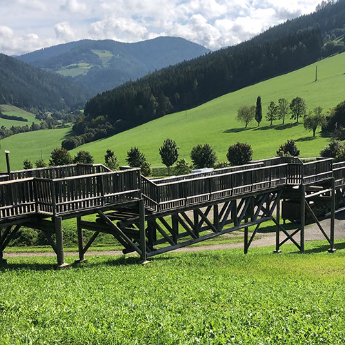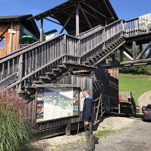 Julia didn't spend a good night and made an appointment with a Shiatsu specialist who advertised in our campground (Viktoria Kozar, +43 (0) 650 810 93 40). But before that we drove to the Wipfel-Wanderweg Rachau (9,50 €/pax): it's Europe's highest treetop hiking trail and at 2.7 km, probably one of the longest! There are a total of 1300 steps. There are loads of steps - one stretch is 148 - so if you are not feeling fit or suffer from vertigo - take the path which is equally spectacular. There are a number of look out points and numerous benches along the way so even though the climb is steep in places it is not too tiring. Children are well catered for and there are lots of creative things for them to do and look out for - insect hotel, natural log xylophone etc. as well as loads of information boards about nature and wildlife. At the end of the treetop section there is a wonderful slide for kids - and some adults - and a great play area with more fantastic views. Lunch at the restaurant "Fuchs und Henne" (24€, nice location, food ok). Drive to the Shiatsu specialist where Julia had an hour treatment (50€ + 35€ for natural tablets Ringana, url: 1515841.ringana.com). Julia is feeling much better now. In the meantime Volker drove to our campground to pay the money for the washing machine and the dryer we forgot to tell them: 11 €). Drive to Knittelfeld to see what the mobile phone guy had been able to do, but he said it was broken. He had cleaned and verified everything, but the main board was dead -too wet. By chance the Handy Shop had a new iPhone SE (249 €) and now Volker is happy. Drink and ice cream at the La Dolce Vita Eiscafé. While Volker was uploading all the stuff from iCloud, Julia did grocery shopping next door at Billa. Drive to Mautern to the Wilde Berge, but they are closed right now. Overnight at their parking, very quiet and lovely dark. N47º23'52" E14º48'58"
