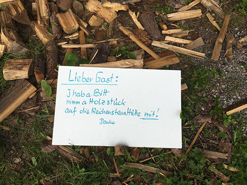 "Dear guest: Please take a piece of wood up to the Reichenstein hut. Thanks."