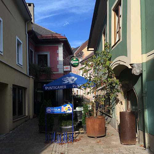 Volker hit the trail to the Predigtstuhl (at 1902 m) on the Rax (4,5 hours, 8,5 km, 850 m ascent). Back home we went to the Edelweißhütte for lunch (20 €). Drive to Sooß where we parked at the Weinbergstraße on a good parking lot with view to the country side. Walking down the main road in Sooß to go to one of the many Heurigen we discovered that there is a special event on the vineyards: "Genussmeile in ther Thermenregion Wienerwald", the longest bar in the world (approx 8 km long) along the 1st Vienna water line hiking path between Mödling and Bad Vöslau. More than 80 stalls offer all kind of food, delicious local wines, champagnes etc. (no entry fee) We did from A1 to A10 this afternoon! N47º59º2" E16º12'26"