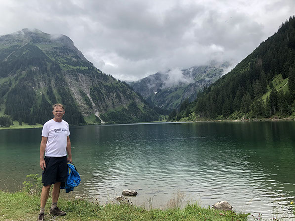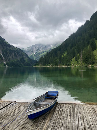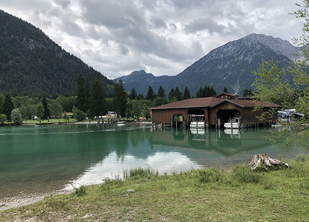 After our Sunday breakfast we took the bus 120 at 10:19 and went down to Tannheim and walked to the Vilsalpsee (about 1 hour, 5 km). Lunch at the Fischerhütte (their speciality is delicious fresh smoked trout, very good 43 €). Back to Tannheim bus 121 (3,60€/pax). Then bus 120 up to Kohlbichl (fare included in our tourist tax card). We were lucky not have rain while away. We went for a swim at the Campsite Panorama Pool and short after the rain started!