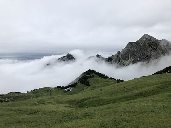 Volker and Julia went up with the Füssener Jöchle cable car (included in our tourist card, 1 time up and down per day) to Sonnenalm where Volker hiked the Gräner Höhenweg to the Bad Kissinger Hütte (10 km, 3 hours 960m descent). Julia went a bit up to the Panorama turning hat and came back. She had a coffee and enjoyed free WiFi at the Sonnenalm with a cup of coffee. She then took the cable car back down while Volker did the hike. Unfortunately today the weather is strange, clouds are coming and going, always hiding the view.