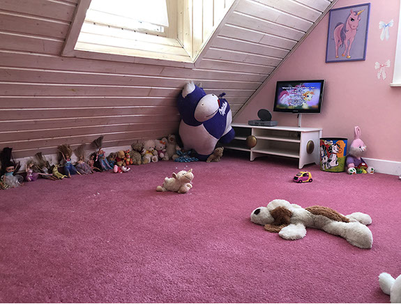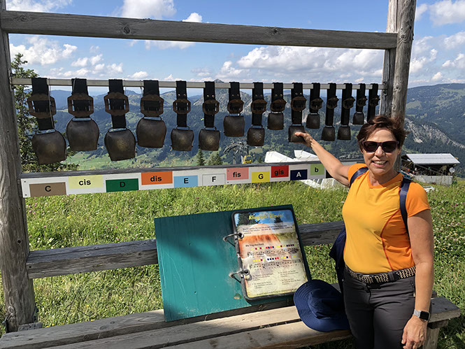 Playing music with the cow bells. Underneath there is a song book with the notes and colours of the bells to hit