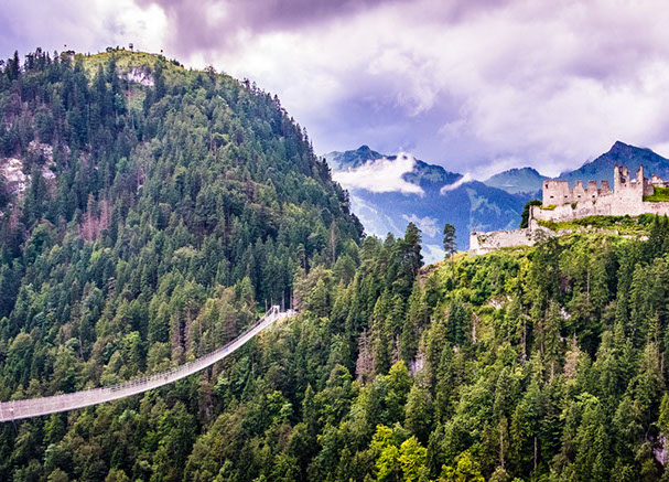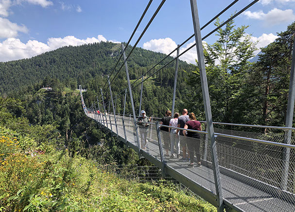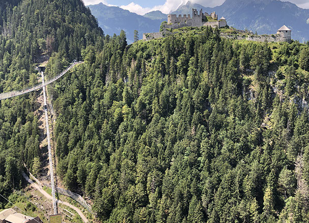 We wanted to go up the cable car Füsslener Jöchle to be able to see what we couldn't 3 days ago because the view was bad from up there with the clouds and the fog. So we drove to the cable car station and went up for free with our tourist card. But this time, weather up there was even worse, with clouds covering the whole northern side. Only the western valley was visible. So 10 minutes later we took the cable car back and drove to the highline 179, the longest Tibetian-stylefoot bridge in Reutte: it is 406 m long and hangs 113 m up the national road -it's also in the Book of Records as the longest foot bridge in Europa. (parking fee: 4€ from 9 to 20:00h) We also visited the Ehrenberg Fort and took the inclined lift Ehrenberg Liner that brings you the 110 m up to the portal of the spectacular suspension bridge. At about 16:00 we settled at the "Sunnawirt" near the Heiterwanger Lake (11€ + 3€ electricity that we didn't book, no dogs allowed, if they find out you have a dog, you pay 80€ fine. Anyway, strange person at the reception). Nice evening spent outside grilling. 1,5 hours phone call with our daughter! N