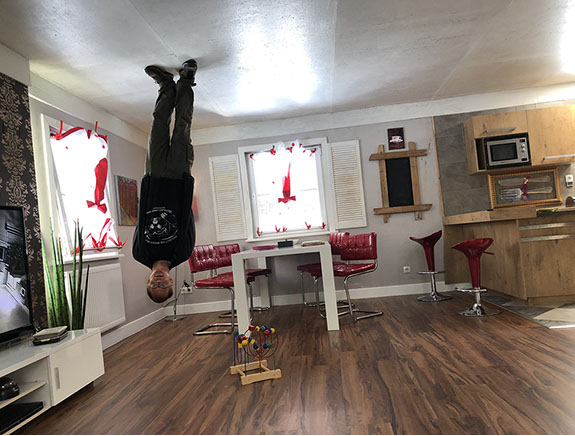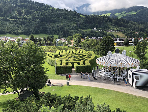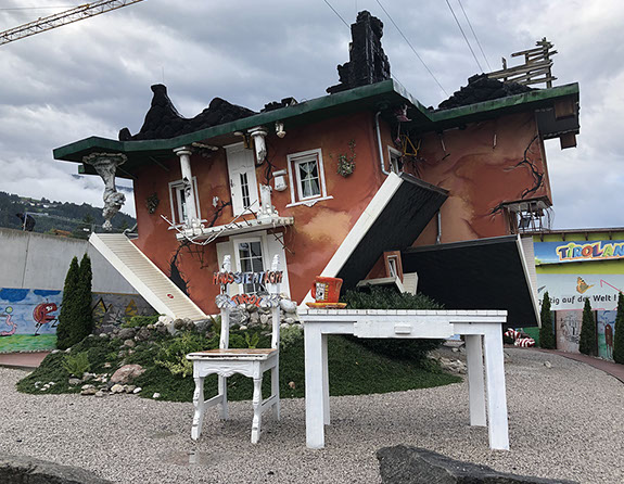 Drive to the "Haus steht Kopf" (= House upside down, 11 €/senior, 13 €/normal adult) in Pill where we were the first clients (opens at 9:00 in July and August). Then we decided to visit the Kristallwelten again, as yesterday it was not possible to see the outdoor performances of "Summer in the Giant" because of the heavy rains. We were lucky to see amazing performances by Freddy Nock tightrope walker, a nice magician Thomas (normally with his wife assistant, but today she was ill), a woman contortionist and a hula hoop performer who is also a woman and contortionist). We spent almost 4 hours enjoying the great things. Drive to Achenkirch on a steep road that leads to the Achensee (Achen Lake). We settled at the Alpen Caravanpark Achensee. Short walk to a snack where we had a local beer before going home under the threat of more rain. N47º29'57" E11º42'22"