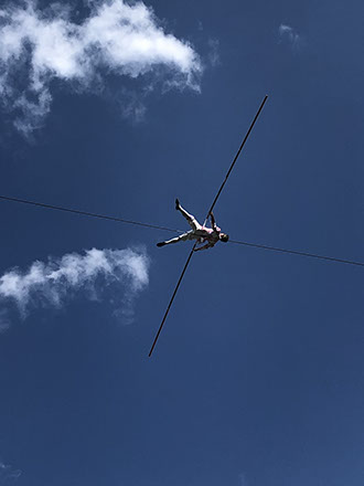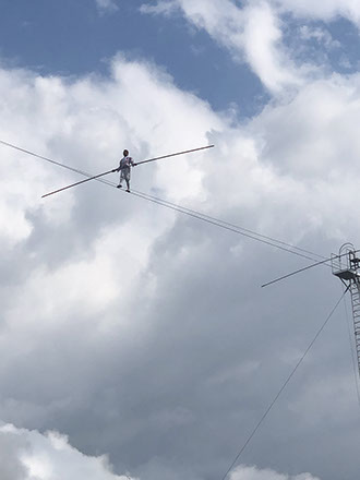 Tight rope walker Freddy Nock dancing 20 m above ground with a harness. He moves across 300 m 5 times a day!