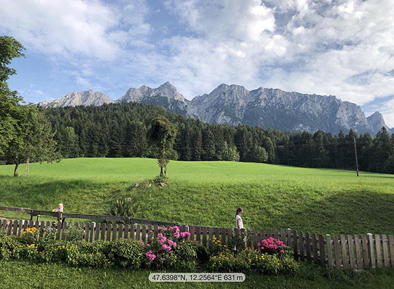Drive to Ledererwirt where we met Elke and Rudi. We drove to the Restaurant Schöne Aussicht and walked up to the Burger Alm where we had a light lunch, then at Wandberghütte where we had Kaiserschmarrn. Over the Karspitze (or almost) we walked down (10,9 km, 6 hours, 560 m ascent). Back home we had a drink before taking a shower and having an excellent dinner. N47º38º26" E12º15'21"