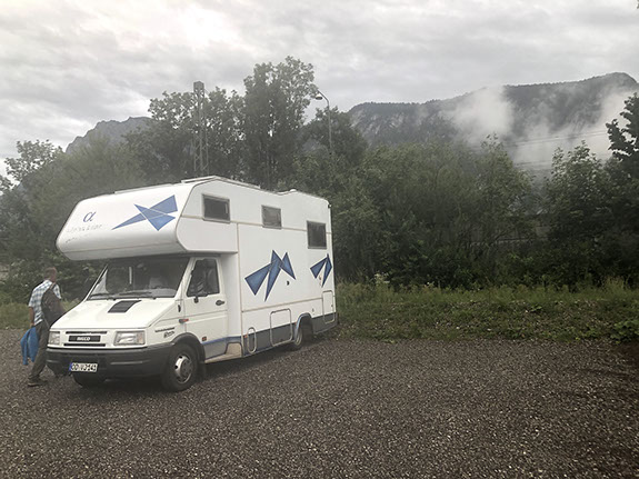 Bye bye, Ledererhof, Elke and Rudi. Unfortunately we didn't come very far, because we have a problem with water coming in from the roof window on top of the kitchen. So we managed to find someone in Itten near Wörgl. We found a good aire with electricity (8 € + 1€/2 kWh) and settled there. Julia went shopping at Rewe while Volker tried to tape the window. In the afternoon we went to innsola Kiefersfelden (18,90 € for both with sauna for Julia and some discount with the guest card). N47º36'40" E12º11'31".