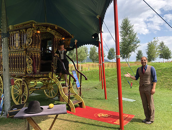 Thomas the magician in front of the 150 old authentic circus trailer - Summer in the Giant by Swarovski