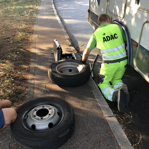 Geplatzter Hinterreifen-Wechsel auf der Autobahn. Ein Glück, dass wir noch (rückwärts!) auf einen Parkplatz fahren konnten