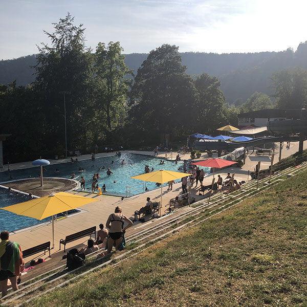 Fahrt nach Blaubeuren. Haben da einen sehr schönen Stellplatz beim Sportheim bzw. Freibad erhalten (18€ mit Strom für 2 Nächte inkl. 1 Eingang zum Freibad). Am Eingang von Blaubeuren haben wir einen Bike-Shop "Bike Station" gefunden und sofort Volkers platten Reifen abgegeben zum Schlauchwechseln. Auch haben wir noch Abendessen bei Norma gekauft. Nachdem er den Reifen abgeholt hat, haben wir nur noch gechillt. Nº48.4152237 E9.7912028º