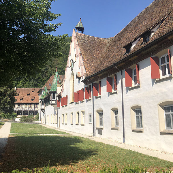 Blaubeuren beim Blautopf. Die Kirche, die zum Kloster gehört, hat ein prägnantes Dach mit gelb-grünen Mosaiken