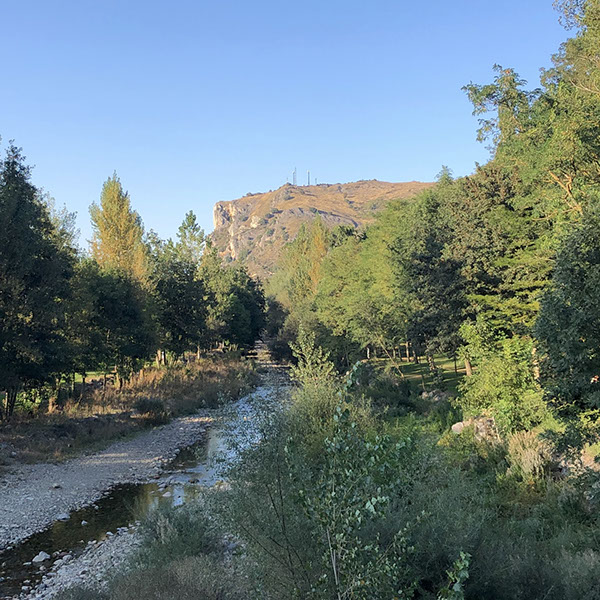 Escaray: der Oja-Fluss mit Blick auf die steilen Felsen in der Nähe von unserem Parkplatz