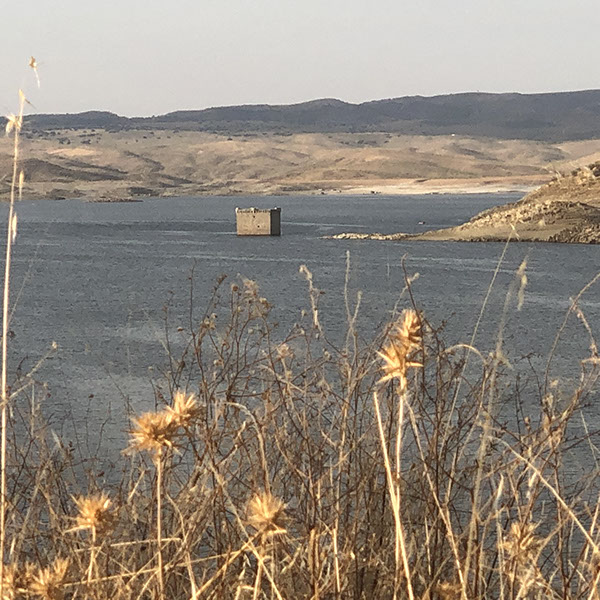 Fahrt über Burgos, Valladolid, Salamanca auf der A62 bis *** mit einem Mittagessen-Stopp bei der Ausfahrt Nr. 142 zum Restaurante Ruta 62 in Villamarciel (sehr gut, gute Portionen, nur 12€/pax für Vorspeise, Hauptspeise, Nachspeise, Kaffee, 1 flasche Rotwein, 1,5 l Wasser!). Dann noch in der Stadt getankt, und durch die Stadt gefahren, so dass wir einen netten Eindruck von Tordesillas bekommen haben und werden sicher nochmal hierher kommen. Fahrt bis vor Cáceres, wo wir nach Westen zu einem Stausee bei Garrovillas de Alconétar gefahren sind uns auf ein Parking gestellt haben, der kein schönen Access hat, aber der Blick ist super. Mitten im See guckt einen alten Turm wie Torre de Belém raus. Es ist sehr warm, und wir haben erst schön geduscht, bevor wir uns dann draußen gesessen haben bis es kühler wurde. Viele kleine Bichos im Wohni, die irgendwie durch das Mosquito-Netz durchgekommen sind. N39º41'26" E6º28'6"