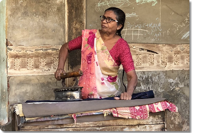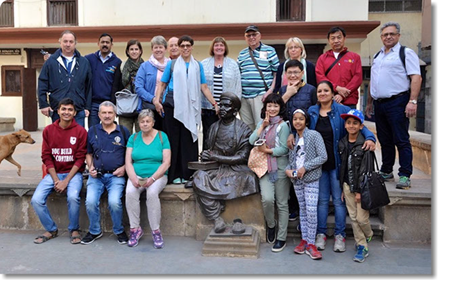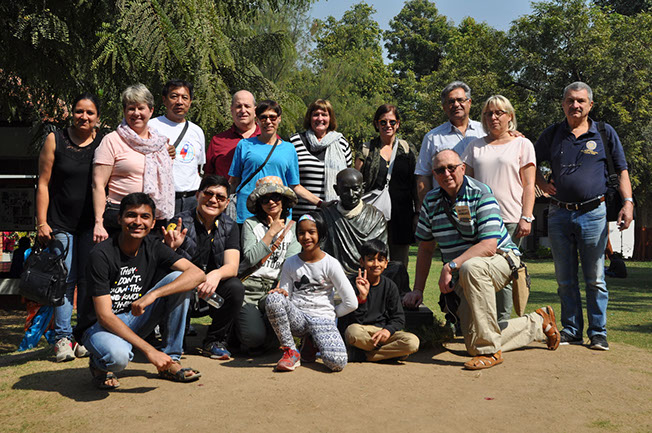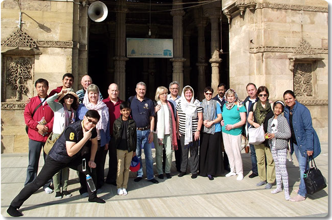 We left Bhuj at 9am. A very important military person was visiting the restaurant in our hotel and was guarded by a few soldiers ready to shoot. We stopped for tea/coffee and restrooms after a ride of 2h50. Lunch with the youth group at the palace §. Visit and shopping at the Traditional Textiles Society of Gujarat. Drive to Hotel Ramada Ahmedabad. After a short refreshing break we gathered on the nice terrace on the 11th floor for mojitos and snacks. Mojito background story: we made a bet with Fernanda/António while in the bus, to guess at what time we would arrive at our hotel. Julia won and Alice bought us all delicious mojitos. And we were happy to be able to eat "normal" food, i.e. not spicy. We had bruschetta, pizza, toasts with noodles (yes!) and others.