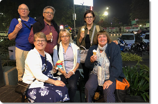 Arrival in Ahmedabad. Alice and Julia went for a walking tour with window shopping and passing along street sellers, and all the people were very kindly with us. Restaurant 1944 and and an ice cream to celebrate Divya's and Bhanu's 14th anniversary. After that we went to the Law Garden market. Back home at midnight.