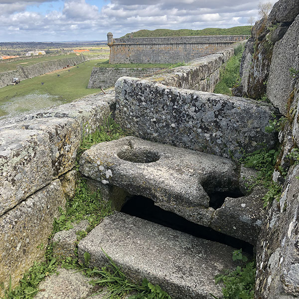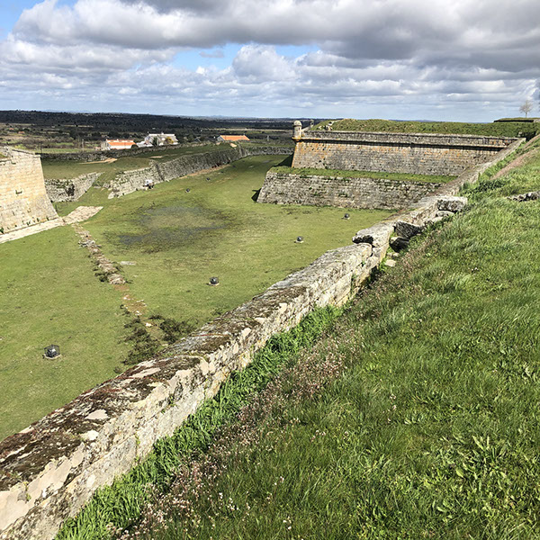 Heute Morgen ist der Bäcker um 8 Uhr gekommen, und wir haben es nicht gemerkt! Da wir gestern Abend uns nicht mehr anmelden konnten, haben wir heute einen der Betreiber (Holländer, sehr nett) kennengelernt und einige Tipps für Wanderungen in der Umgebung erhalten. Auch ein Buch über die Wanderungen im Alto Alentejo kostenlos bekommen. Weiterfahrt nach Almeida, wo wir uns auf dem offiziellen Stellplatz installiert haben (scheint kostenlos zu sein, INKL. Strom!). Nach dem traditionnellen Spaghetti Bolognese im Wohni sind wir hoch zur befestigten Stadt mit zahlreichen Befestigungen, Graben, Kasernen etc. aus dem 17./18. Jh. Kaffee bei der "Bar S. Francisco". N40º43'44" W6º54'6"