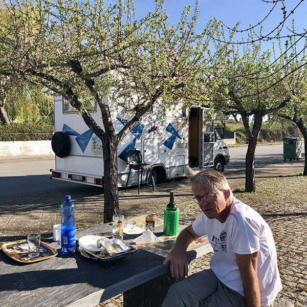 Wegen des Estado de Emergência, das gestern in Portugal ausgehängt wurde, haben wir entschieden, zurück nach Hause zu fahren. Allerdings ist unsere Reinigungs-Fee, Sra. Maria Joäao, bei uns im Hause, so dass wir vor dem Hause im Wohni sitzen und warten, bis sie fertig ist, bevor wir wieder ins Haus gehen.