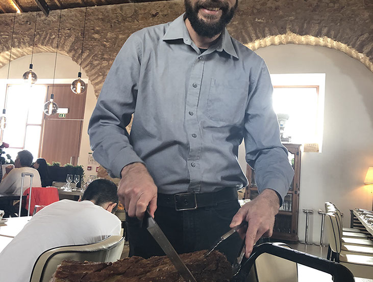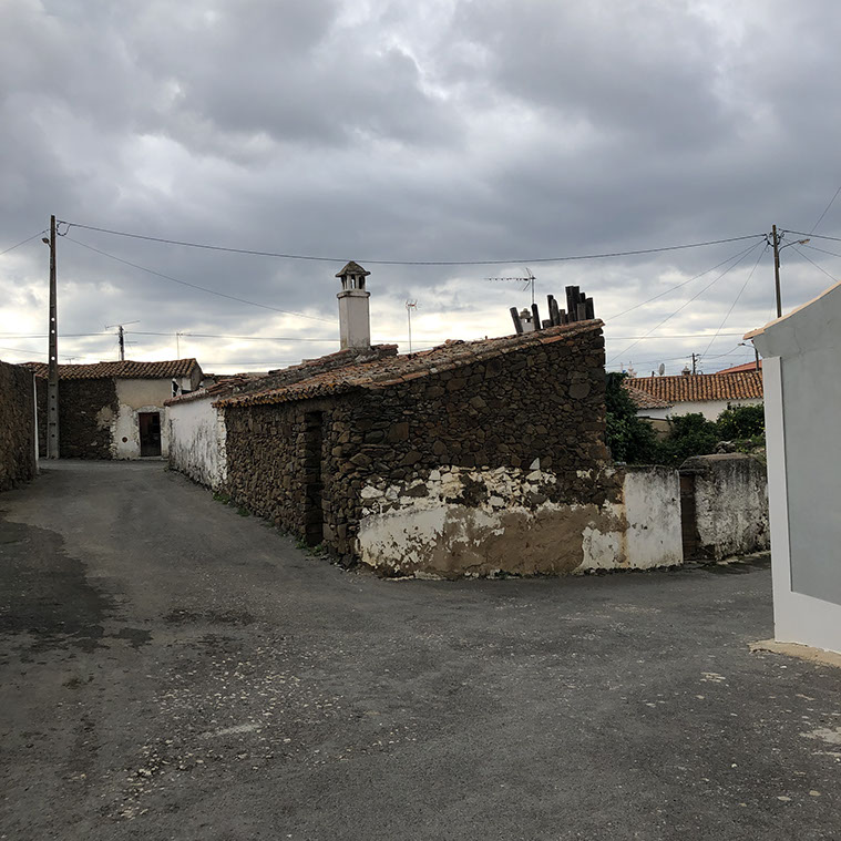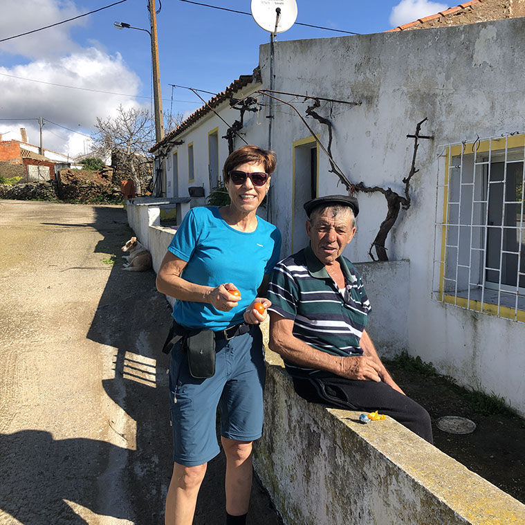 Talking to Mr Reves in Fonte de Zambujo. It is his 63rd birthday today. He gave us mandarines