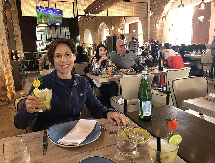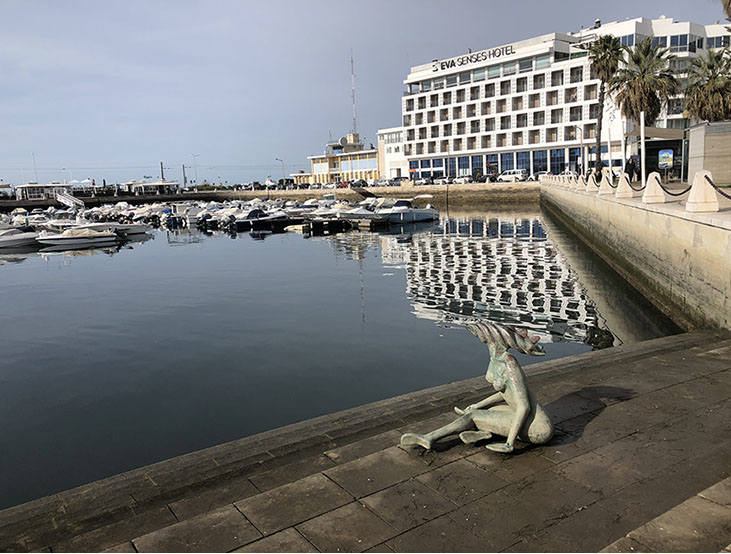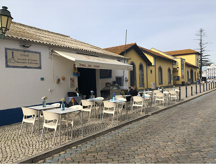 Walk to harbour Cais Comercial and back with a stop for lunch at the Sabores do Churrasco, a nice Rodizio (±55 €). While Volker drove home to get the theatre tickets for our tonight show "Luís de Matos Impossível ao Vivo", Julia went shopping at Decathlon.