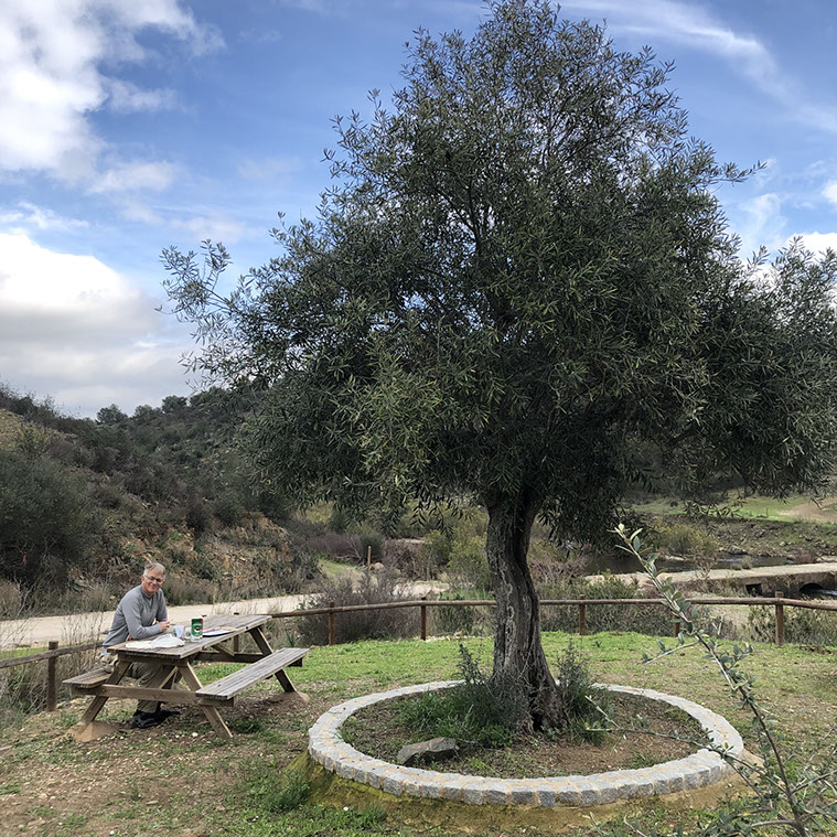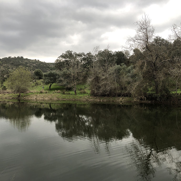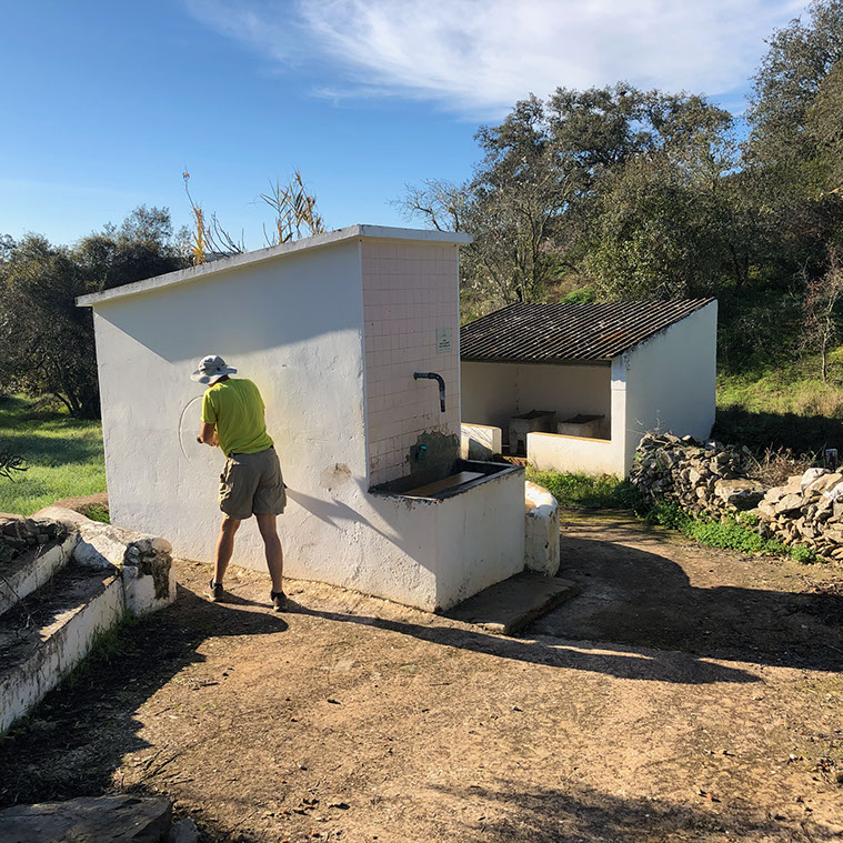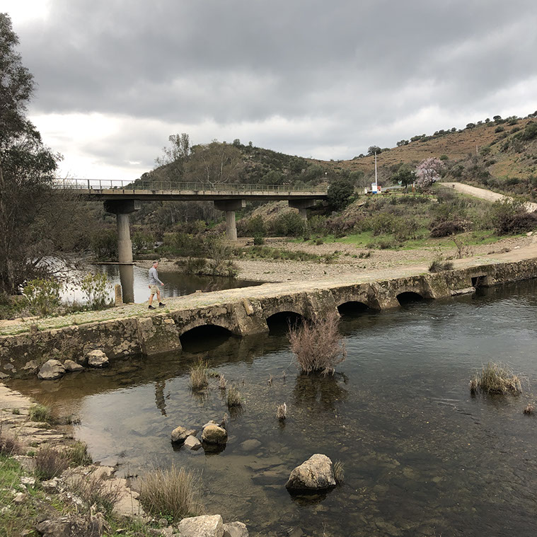 Drive to Ayamonte, grocery shopping at Mercadona in the Plaza Mall, drive to the border from Alentejo to Algarve on the river Vasão. There we had lunch at the picknick area and then did the MTL-PR8 walk (one of those that we did for the Câmara Municipal de Mértola) (5km, 1,5 hours). Drive to Giões where we walked thr0ugh the rural village, had a coffee at the snack-bar do Poço Novo. Drive to Pereiro where we stayed overnight on a aire (Parque de Merendas e Autocaravanismo do Pereiro, free of charge and very quiet) with view onto a reservoir. N37º26'40" W7º35'17"