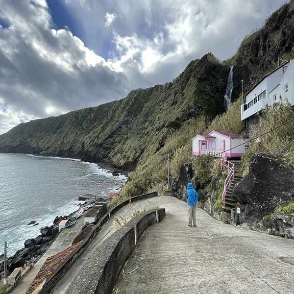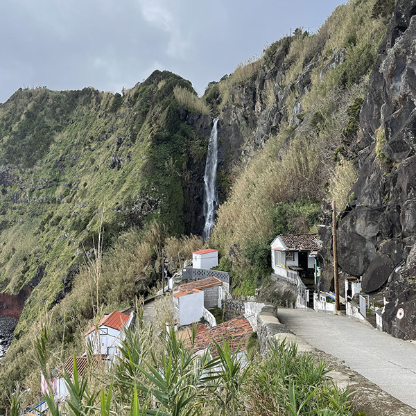 Nordeste: Weg vom Farol Ponta do Arnel runter zum Meer am Wasserfall vorbei