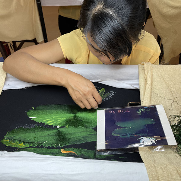 Besuch der Seidenfabrik Thang Loi wo sogar am Sonntag fleißig gestickt wird
