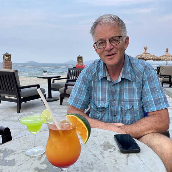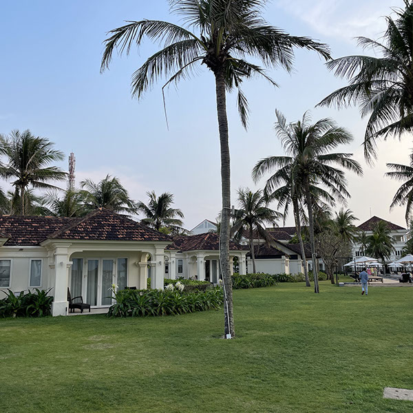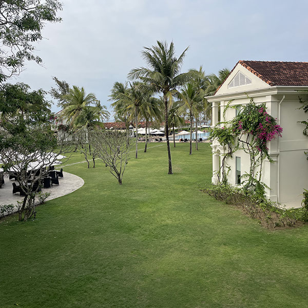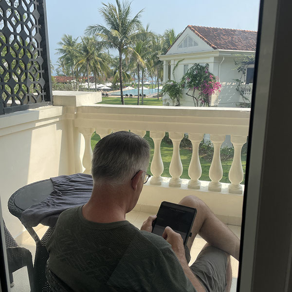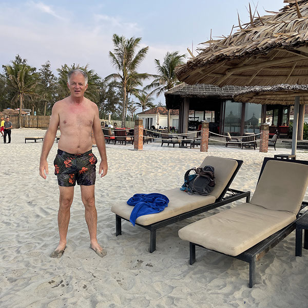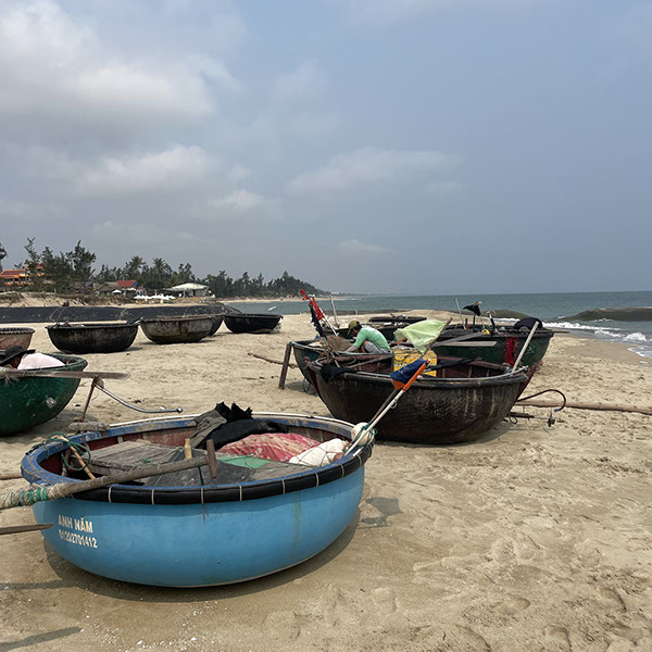 Abfahrt um 9 Uhr. Besichtigung des Mausoleums von Khai Dinh. Danach zu dem Lagoon Lang Co Bay. Hochgefahren zum Pass Hai Van Pass auf 496 m, wo ein französisches Fort ist und einige Bunker vom Vietnam Krieg. Danach in Danang angehalten bei einer Marmor-Verarbeitungsanlage. Walking Tour in Hoi An old town: Baguette Báhn My bei Sum gegessen, Besuch der Seidenfabrik Thang Loi, wo auch geschenidert wird, merchant houses, Japanses Covered Bridge, pagodas and assembly halls. Wir bleiben 3 Nächte im Boutique Hoi An Resort, das sehr schön am Südchinesischen Meer liegt. Wir haben noch ein Cocktail an der Beach Bar getrunken, bevor wir abends im Restaurant gegenüber vom Hotel gegessen haben. Alle winken uns zu.