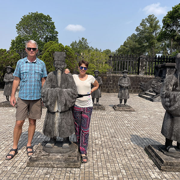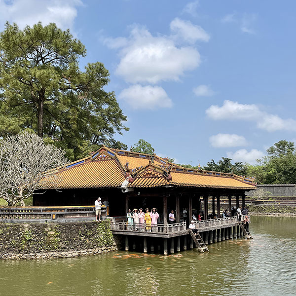 Julia Yoga um 7:30 Uhr bis 8:10 Uhr. Üppiges Frühstück. Um 9 Uhr abgeholt und Bootsfahrt auf dem Parfümfluss zur Pagode der Himmelsgötter (Chua Thien Mu). Der Fluss der Wohlgerüche oder Parfümfluss heißt so, weil er 60 km entfernt im Truong Son entspringt, wo dunftender winder Ginseng wänchst. Dann zur Zitadellenstadt, die als Verteidigungsanlage und Königssitz diente. Er legte Zitadelle und Palste nach den strengen Regeln der Geomantik und im Einklang mit den Aspekten der Astrologen an. Dort haben die Herrscher bis 1945 gelebt. Mit einem leckeren Salted und Coconut coffee vom hübschen Café unten sind wir hoch zur Vong Canh Hill's peak gelaufen, wo noch Bunker vom Krieg stehen. Dann zum Grab von Tu Duc, dem vierten Kçnig (1847-1838). Tu Duc war kinderlos, häufig krank. Er hatte 100 Konkubinen und mehrere Söhne aus der königlichen Familie adoptiert. 16 Jahre vor seinem Tod (1867) war seine weitläufige Grabanlage, fertiggestellt. Er hatte alles für seinen Tod vorbereitet. Wir sind gegen 14:30 Uhr im Hotel angekommen und im Pool geschwommen. Um 16:30 Uhr den Shuttle in die Stadt genommen. Da wollen wir im Restaurant "Bistro La Carambole" (700 VND) essen, Spaziergang durch die belebte Stadt und noch ein Bier bei einer Bar, wo die Musik dann so laut wurde, dass wir dann doch ein Taxi zum Hotel genommen haben (89k VDN, haben 100K gegeben). Hue hat nur 300.000 Einwohner und hat so viele Lokale, Restaurants und Hotels, es ist einfach unglaublich.
