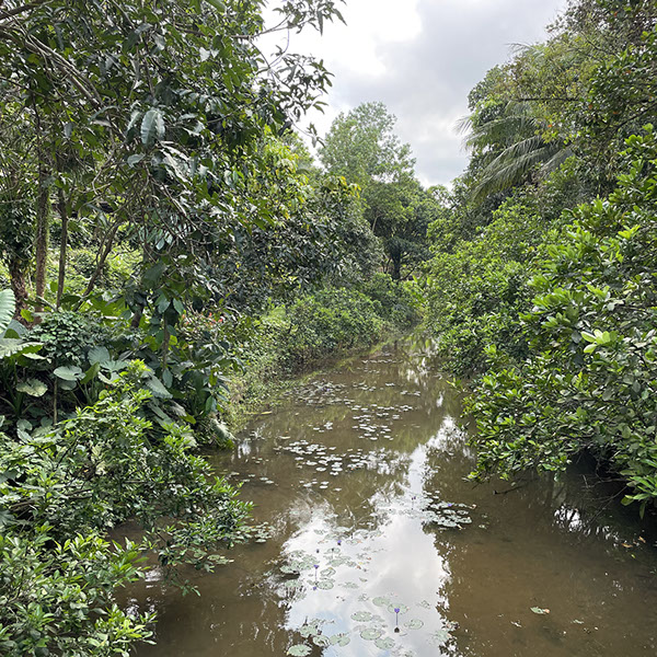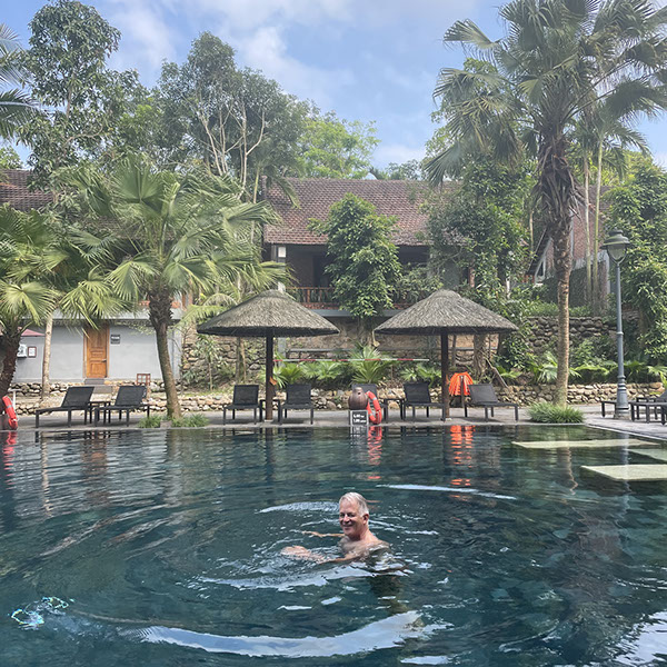 Fahrt von Mai Chau mit einem Halt am Café Vuon Hang zum Flughafen Hanoi. Flug VN1547. Hotel Pilgrimage Village. Wir wurden von der sehr netten Guide Hana und dem Fahrer Tan abgeholt. Unser Zimmer 152, eigentlich eine Suite/Bungalow befindet sich zwischen dem großen Pool und dem See. Abends sind wir gegenüber dem Hotel im Eco-Restaurant essen gegangen (300K VDN).