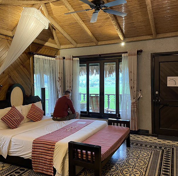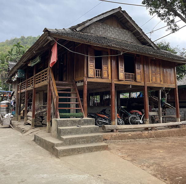 Nach dem Frühstück 45 Minuten zum Dorf Xa Linh hoch gefahren (1150 Höhenmeter, das von dem Bergvolk der H'mong bewohnt ist. Sehr interessanter Spaziergang und Besuch eines Hauses einer älteren Frau mit zwei Enkelkindern (sehr beindruckend, wie basic sie leben!). Runterfahrt nach Mai Chau Mittagessen in der Sunset Bar Boutique Hotel, sehr lecker, in unserem Package inklusive. Nachmittags zum Dorf Sam Khoe gefahren, wo wir einen Spaziergang bei weißen Thai Dorf gemacht haben, angeblich vor den Tonkinesischen "Alpen". Danach zurück ins Hotel und Julia Thai-Massage um 18 Uhr, Volker noch Spaziergang im Dorf.