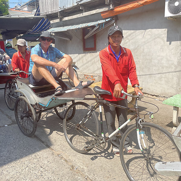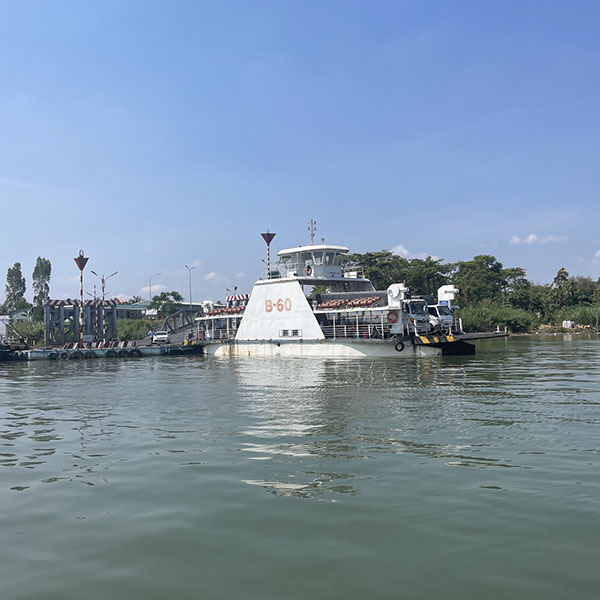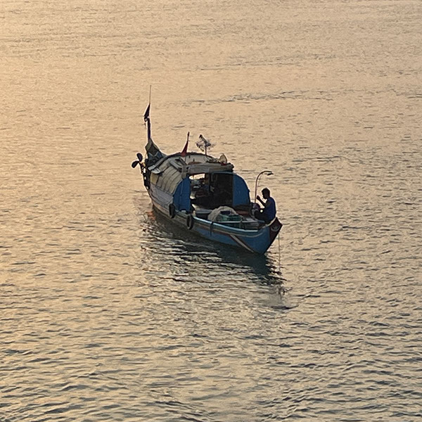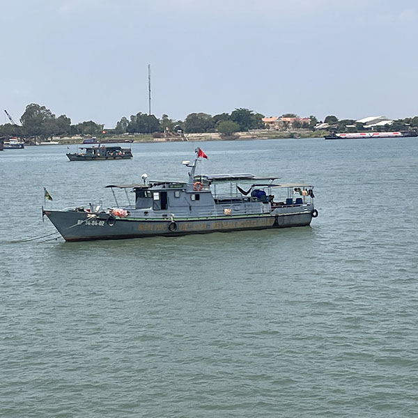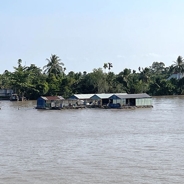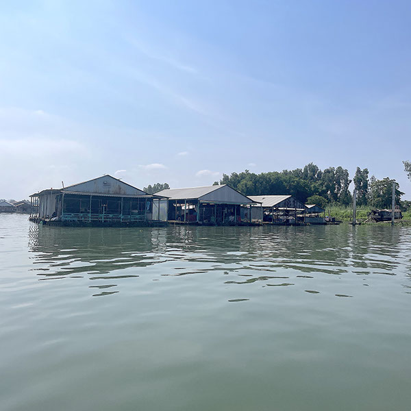 Besuch von der Stadt Tan Chau (ca. 180.000 Einwohner). Markt, dann Fahrt mit einem Xeloi (eine Art Rikschaw), dann mit dem Tender zu einer schwimmenden Fischfarm. Überquerung nach Kambodscha! Geeankert noch vor Phnom Penh.