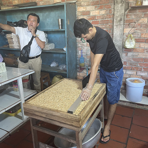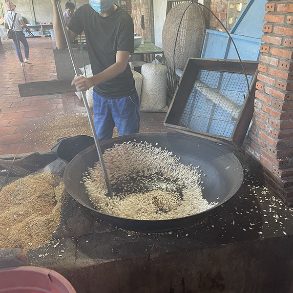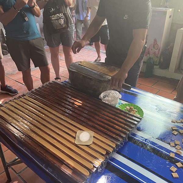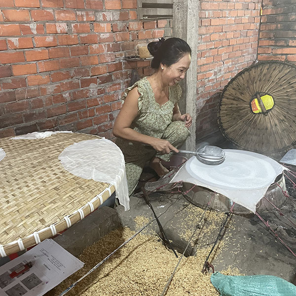 Um 6 Uhr aufgestanden, Kaffee getrubnken, 6:30 Uhr Tai Chi, sehr schön. Nur Volker hat richtig gefrühstückt, ich habe nur 3 Mini-Bananen gegessen. Heute gehen wir zum Dorf von Cái Bè. Dort haben wir uns anschauen können, wie Reispapier gemacht wird (das wusste ich schon), danach wie Kokosnussmilch extrahiert wird und daraus Bonbons gemacht werden (die sehr lecker sind!). Darüberhinaus, wie Reispopps und Nudelpopps (diese sind besonder lecker! da haben wir eine Packung gekauft für 40k VDN) gemacht werden, auch Reisschnapps (mit Schlange usw.). Zurück zum Schiff um 11 Uhr, chillen, Mitttagessen und um 14:30 Uhr auf dem Weg zur Insel Binh Thanh Island in Sadec besuchten wir eine ursprüngliche Gemeinschaft. Unser Schiff Jahan ist heute bis vor Tan Chau (22 Uhr) gefahren. Wir haben noch den Film "Good Morning Vietnam von 1987 gesehen, bevor wir ins Bett gegangen sind.