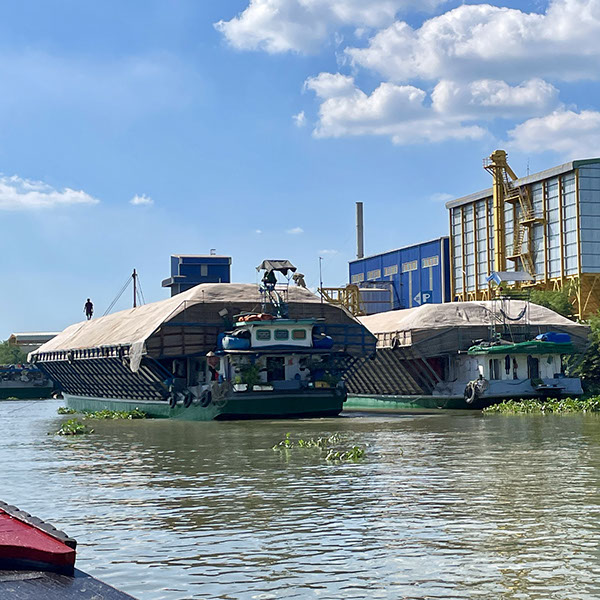 Große Reisfabriken und Schiffe, die den Reis kaufen und transportieren