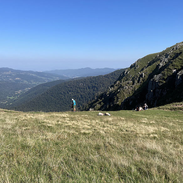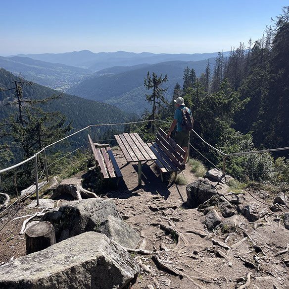 Col de la Schlucht: Wanderung Sentier des Roches. Ein Rastplatz mit weitem Blick