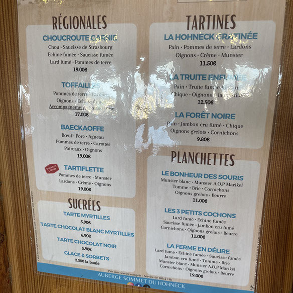 Auf dem Weg zum Petit Ballon haben wir gleich den Jardin d´Altitude du Haut Chitelet besucht (5,80€/pax, 3,40€/senior, 1. Sonntag des Monats kostenlos). Runter zur Ferme Auberge Le Kahlenwasen, wo wir das Repas Marcaire gegessen haben. Es handelt sich dabei um ein traditionelles Menü, das in den Bauerngasthöfen der Hautes-Vosges serviert wird. Es besteht aus einer Suppe, einer "Tourte" (Fleischpastete), dann Kassler mit "roïgabrageldi" (Kartoffelstreifen, die 2-3 Stunden mit Bauernbutter, manchmal auch Zwiebeln und Speck gekocht werden) + Nachspeise Blaubeeren-Törtchen (60€ alles ungewöhnlich aber gut!). Natürlich mussten wir danach die 80 Höhenmeter mit vollem Bauch hochlaufen... Siesta! Volker ist noch zum Petit Ballon hochgelaufen (3,3 km, 140 Höhenmeter) während ich gemütlich im Wohni gelesen und Kaffee getrunken habe. N47º59'7" E7º7'20"