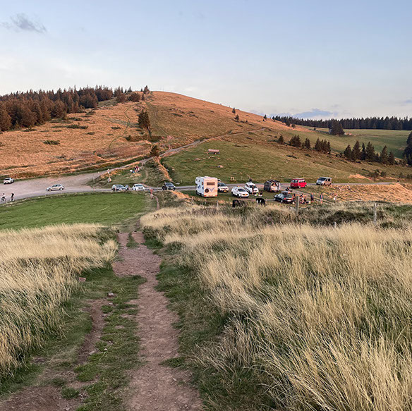 Fahrt zum Grand Ballon, alles sehr voll. Ganz nach oben gelaufen. Weiter zum Ballon d'Alsace, wo wir erst an einer Stelle standen, die zwar schön war, aber laut wegen der Straße. Alles sehr voll. Dann weiter zum Parkplatz P2 Gentiane beim Parc d'Aventures, wo wir hingelaufen sind. Leider hat die Snackbude nichts Anständiges und alles in der Sonne. Wo wir jetzt stehen ist auch nicht ganz ruhig aber viiiiel besser! N47º48'5" Eº6'50"51