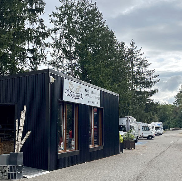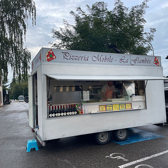 Hirtzbach: am Mittwoch steht dieser Flamm-Pizza-Kiosk an unserem Stellplatz. Natürlich haben wir ein Flammkuchen von ihm gegessen!