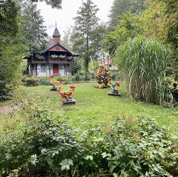 Fahrt nach Hirtzbach und auf dem Womo-Stellplatz neben einer Bäckerei-Konditorei installiert (kostenlos, Ver- und Entsorgung!). Spaziergang durch das nette Dorf mit einem Back in der Mitte, dann durch den sehr hübschen und mit Kunstwerken gespickt, auch den Parc Charles de Reinach, wo noch ein Eiskeller steht. Fahradtour nach Altkirch (12 km) um Eis zu essen ;). Als wir zurückkamem, stand ein Kiosk mit Pizza und Flammkuchenofen da, so dass wir gleich für später einen Flammkuchen bestellt haben (9€ für einen großen guten Flammkuchen). N47º36'1" W7º13'32"