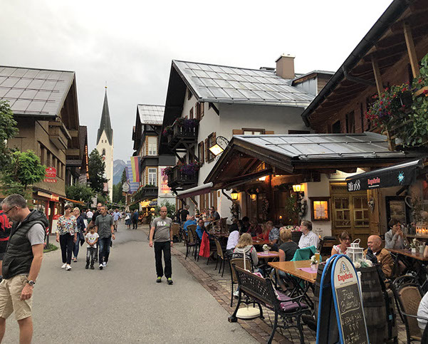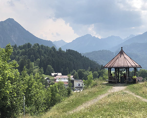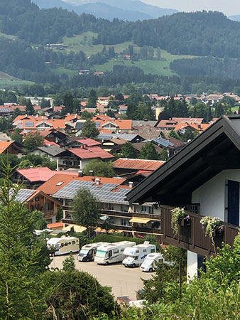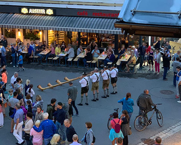 We took our bicycles and went to the oldtown, through the old red town gates . We had a coffee at the Kaffeerösterei, walked around before driving to Oberstdorf where we stayed at the aire Geiger (39,60€ with city tax + 5€ card guarantee/pax). The "reception" is held by a GOM (grumpy old man, or #$% but not as subtle nice). Lilo and Klaus came with their car to our camper, took the 3 boxes of wine, and also us, and we had lunch at the "Traube" all together (very good food!). In the evening we went to the opening concert Oberstdorfer Musiksommer at the Oberstdorf Haus. Concert with the Württembergische Philharmonie Reutlingen with an introduction by the Jodlergruppe Oberstdorf. The solists were absolutely brilliant: Wen-Sinn Yang, Violoncello, Maria-Elisabeth Lott, Violine, Maestro: Gregor A. Mayrhofer.