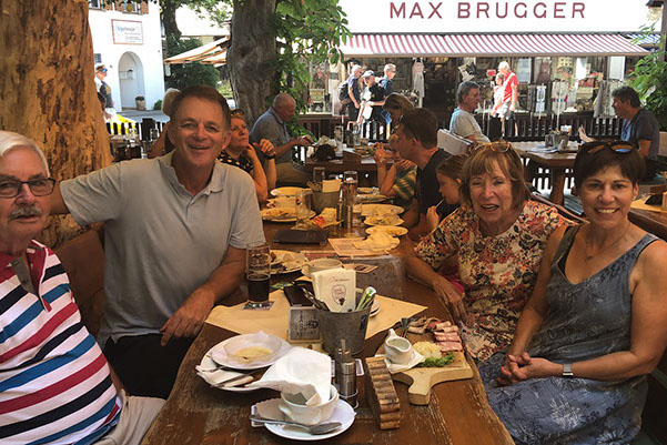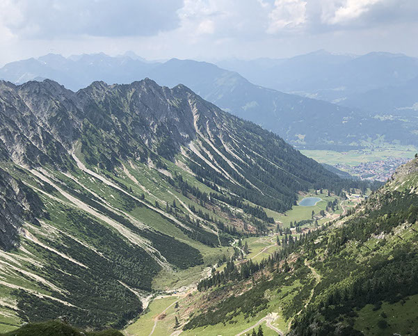 Volker and Julia took the Nebelhorn-Bahn up to Höfatsblick (alt 1932 m). We wanted to walk from there down to Alpsee? #$%, but the trails were closed, so we had a light lunch before going down with the cable car to Alpsee #$% from where we walked down to Oberstdorf (about 1,5 hours). We all wanted to go to the Oberstdorfer Beargfest (Street Festival) which began at 17:00, but we took the bus and went to Lilo's and Klaus' place because it was pooring rain outside. We waited until the weather calmed down and went to have dinner at the Traube (this time we sat inside). After this, the weather turned to good and we visited some shops, getting free champaign mainly with raspberries or strawberries.