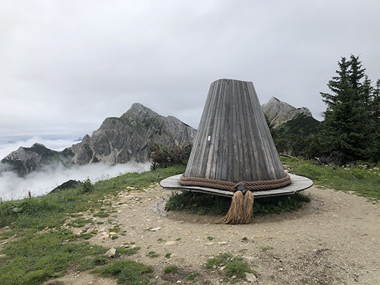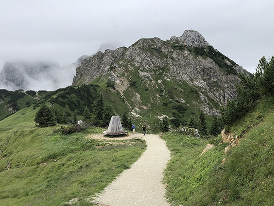 Volker and Julia went up with the Füssener Jöchle cable car (included in our tourist card, 1 time up and down per day) to Sonnenalm where Volker hiked the Gräner Höhenweg to the Bad Kissinger Hütte (10 km, 3 hours 960m descent). Julia went a bit up to the Panorama turning hat and came back. She had a coffee and enjoyed free WiFi at the Sonnenalm with a cup of coffee. She then took the cable car back down while Volker did the hike. Unfortunately today the weather is strange, clouds are coming and going, always hiding the view.