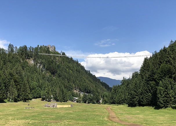 We wanted to go up the cable car Füsslener Jöchle to be able to see what we couldn't 3 days ago because the view was bad from up there with the clouds and the fog. So we drove to the cable car station and went up for free with our tourist card. But this time, weather up there was even worse, with clouds covering the whole northern side. Only the western valley was visible. So 10 minutes later we took the cable car back and drove to the highline 179, the longest Tibetian-stylefoot bridge in Reutte: it is 406 m long and hangs 113 m up the national road -it's also in the Book of Records as the longest foot bridge in Europa. (parking fee: 4€ from 9 to 20:00h) We also visited the Ehrenberg Fort and took the inclined lift Ehrenberg Liner that brings you the 110 m up to the portal of the spectacular suspension bridge. At about 16:00 we settled at the "Sunnawirt" near the Heiterwanger Lake (11€ + 3€ electricity that we didn't book, no dogs allowed, if they find out you have a dog, you pay 80€ fine. Anyway, strange person at the reception). Nice evening spent outside grilling. 1,5 hours phone call with our daughter! N