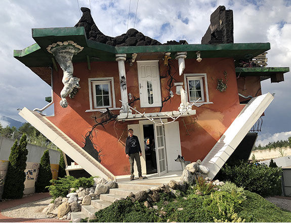 Drive to the "Haus steht Kopf" (= House upside down, 11 €/senior, 13 €/normal adult) in Pill where we were the first clients (opens at 9:00 in July and August). Then we decided to visit the Kristallwelten again, as yesterday it was not possible to see the outdoor performances of "Summer in the Giant" because of the heavy rains. We were lucky to see amazing performances by Freddy Nock tightrope walker, a nice magician Thomas (normally with his wife assistant, but today she was ill), a woman contortionist and a hula hoop performer who is also a woman and contortionist). We spent almost 4 hours enjoying the great things. Drive to Achenkirch on a steep road that leads to the Achensee (Achen Lake). We settled at the Alpen Caravanpark Achensee. Short walk to a snack where we had a local beer before going home under the threat of more rain. N47º29'57" E11º42'22"