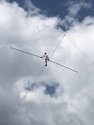 Tight rope walker Freddy Nock dancing 20 m above ground with a harness. He moves across 300 m 5 times a day!