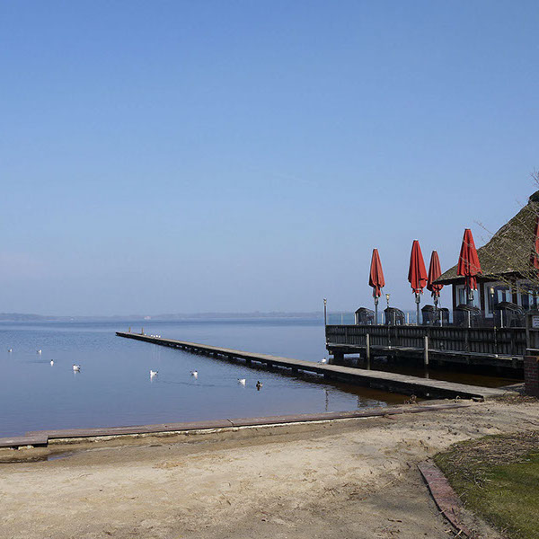 Am Strandcafé mit tollem Blick auf das Zwischenanhner Meer mit Strand und Fähranlage