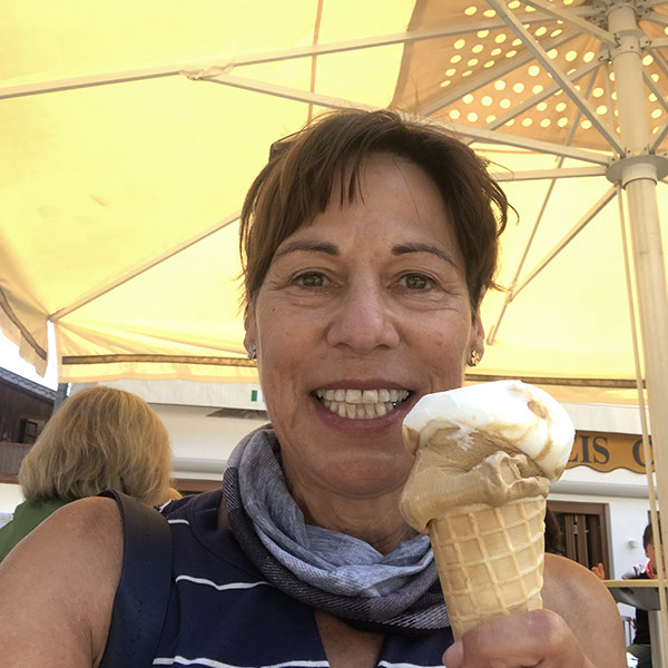 Julia glücklich beim Eis-Essen bei Paradiso, seeehr lecker und große Kugeln in Oberammergau während Volker eine anstrengende Wanderung macht