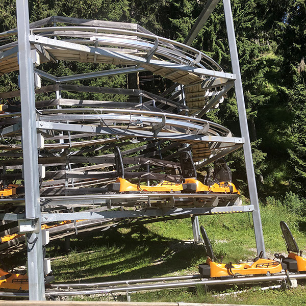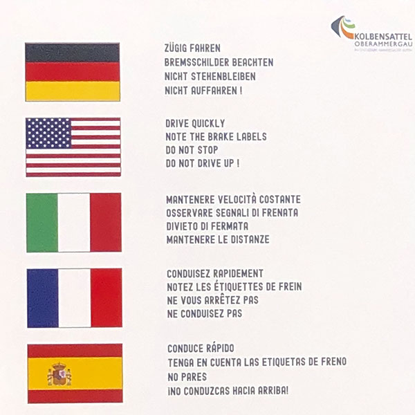 Herrliche Erklärung zu den Regeln beim Runterfahren mit dem Alpine Coaster: Im Englischen und Spanischen soll man nicht "nach oben" fahren. Im Französischen soll man die Dinger gar nicht fahren